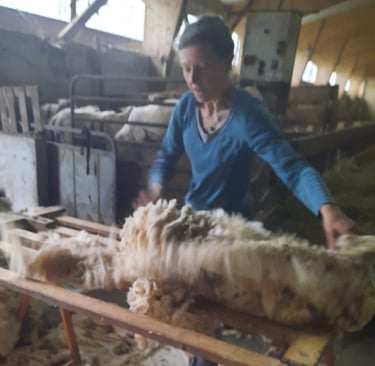 Le tri sur place, lors de la tonte, a été compliqué, pour une première, imaginez 350 brebis et 3 tondeurs qui tondent plus vite que leur ombre, impossible de trier la laine sur place toute seule ! La persévérance et l'envie d'aller au bout de mon projet, m'a amené à tout déballer à la maison et à trier durant une semaine.