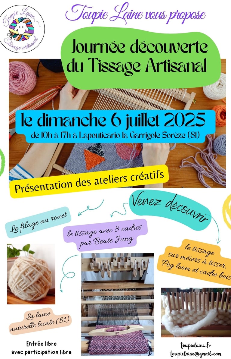 Plongez dans l'univers laineux et artisanal de Toupie Laine. Participez aux ateliers créatifs de tissage , apprenez des techniques traditionnelles et redécouvrez la richesse de la laine locale. Soutenez les éleveurs tout en créant des oeuvres uniques et faites main dans une ambiance conviviale.