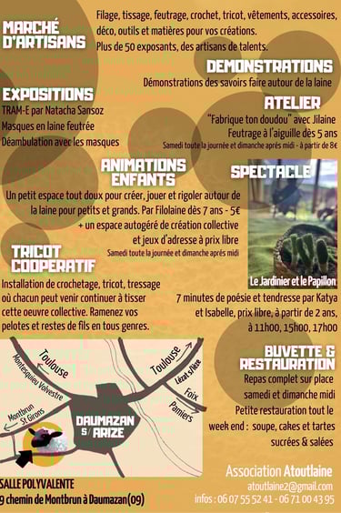 Je propose des Ateliers créatifs "Fabrique ton fil magique", "fabrique ta toupie laine", "petit sac en laine" au Mas d'Azil le 19 et le 20 juillet 2025. Pour tout renseignement ou inscription, merci de m'envoyer un mail.